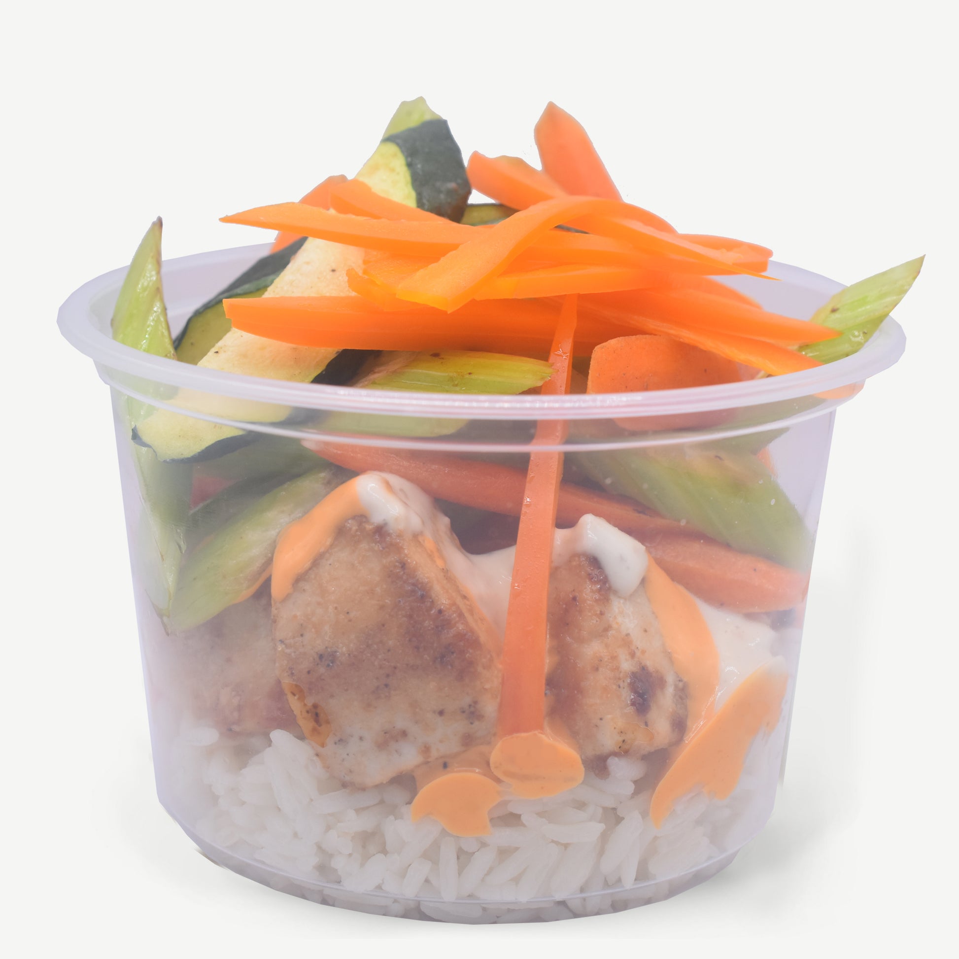 This dish is made with chicken breast, rice, egg, lemon, lime, honey, chili oil, celery, carrots, bell pepper, scallion, olive oil, onion, garlic, paprika, salt and pepper. (Paleo meals come without rice, and have extra vegetables.)