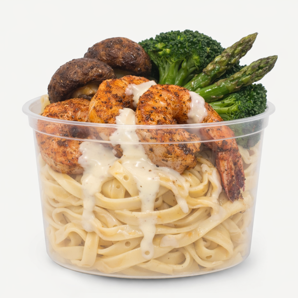 This dish is made with shrimp, gluten-free pasta, coconut milk, almond milk, cremini mushrooms, broccoli, asparagus, onion, garlic, paprika, red pepper flake, olive oil, salt and pepper. (Paleo meals come without pasta, and have extra vegetables.)