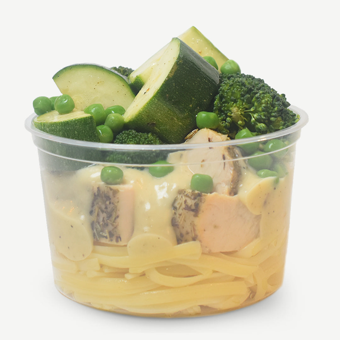 This dish is made with chicken breast, gluten-free pasta, broccoli, coconut milk, zucchini, peas, garlic, onion, Daiya Mozzarella Cheese, vegetable stock, olive oil, parsley, salt and pepper. (Paleo meals come without pasta, and have extra vegetables.)