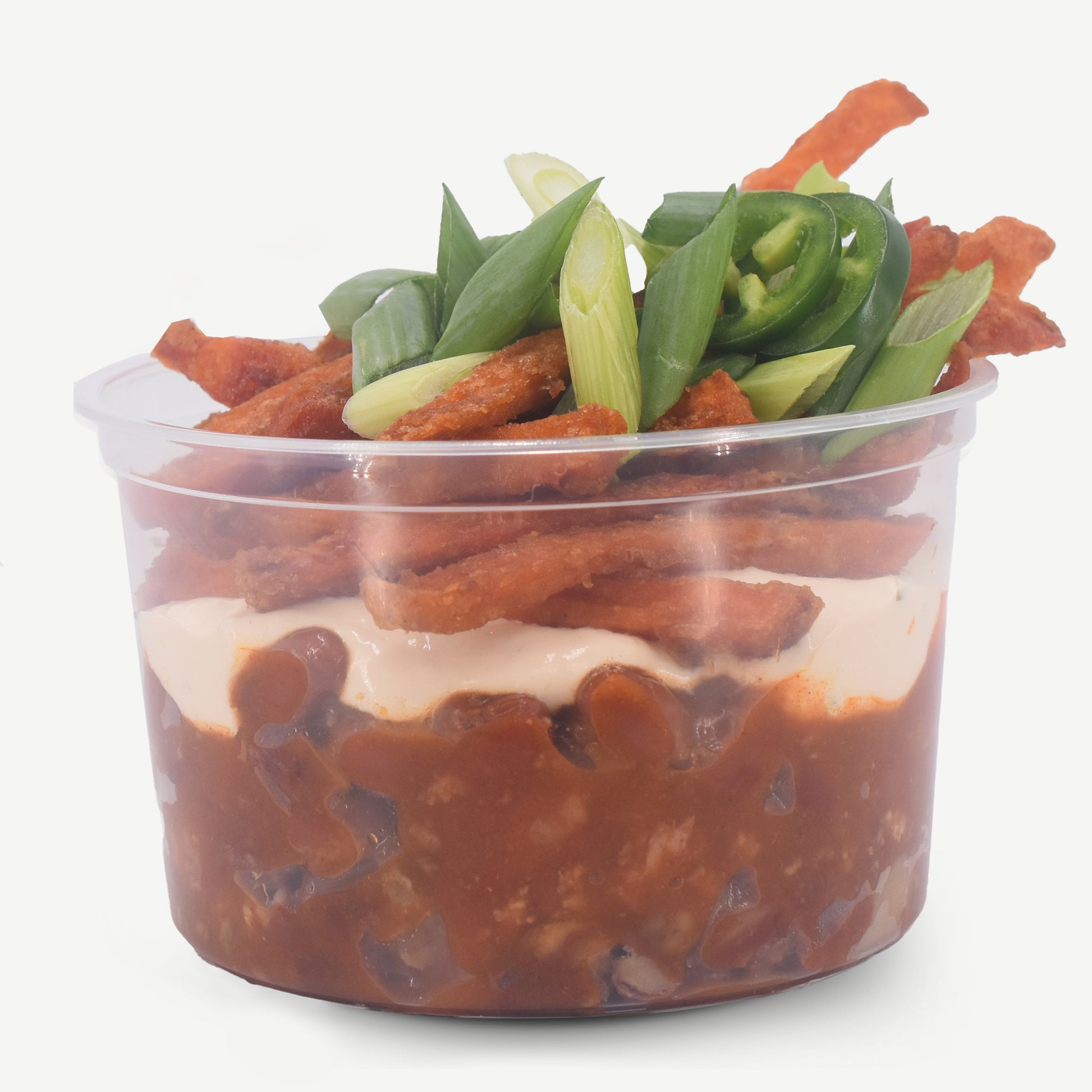 This dish is made with beef, pork, sweet potatoes, kidney beans, tomatoes, peppers, onion, garlic, honey, paprika, cayenne, cumin, coriander, coconut milk, almond milk, tapioca, jalapeno, scallion, olive oil, salt & pepper. Nutrition Information (per container): 475 calories, 26g protein, 21g carbs, 10g fat