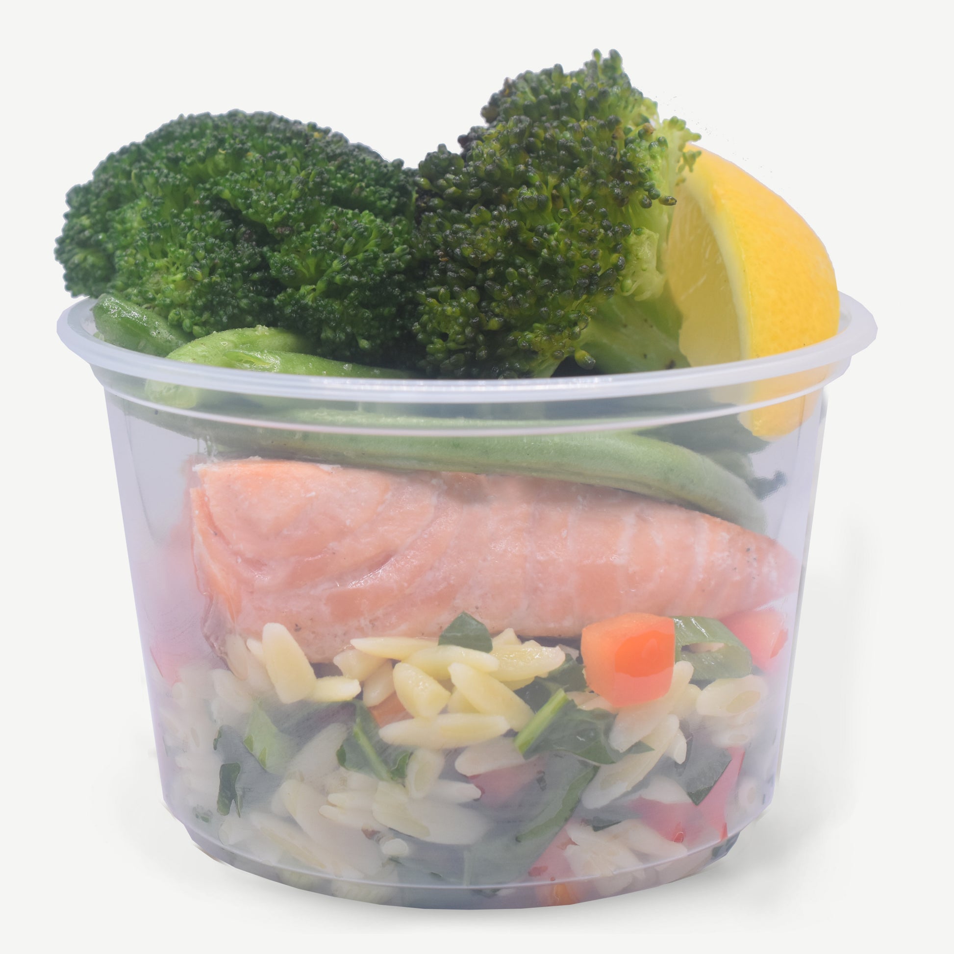 This dish is made with Atlantic salmon, gluten-free orzo, green beans, bell peppers, onion, garlic, broccoli, carrots, orange, lemon, lime, spinach, scallions, honey, olive oil, salt and pepper. (Paleo meals come without orzo, and have extra vegetables.)