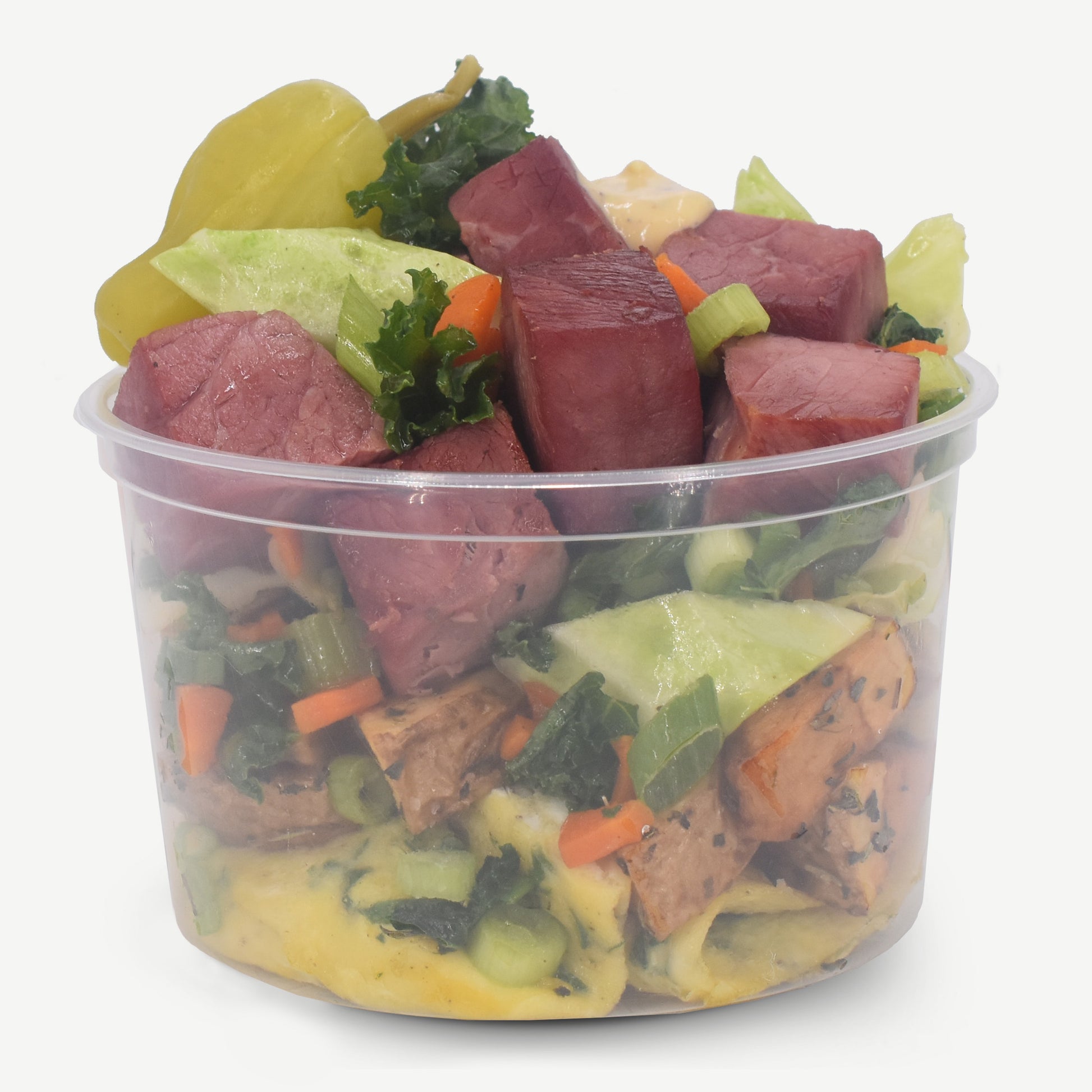 This dish is made with eggs, NYC Deli style corned beef brisket, potatoes, carrots, celery, kale, leeks, scallions, pepperonchini, onion, garlic, mustard, parsley, thyme, olive oil, salt and pepper.
