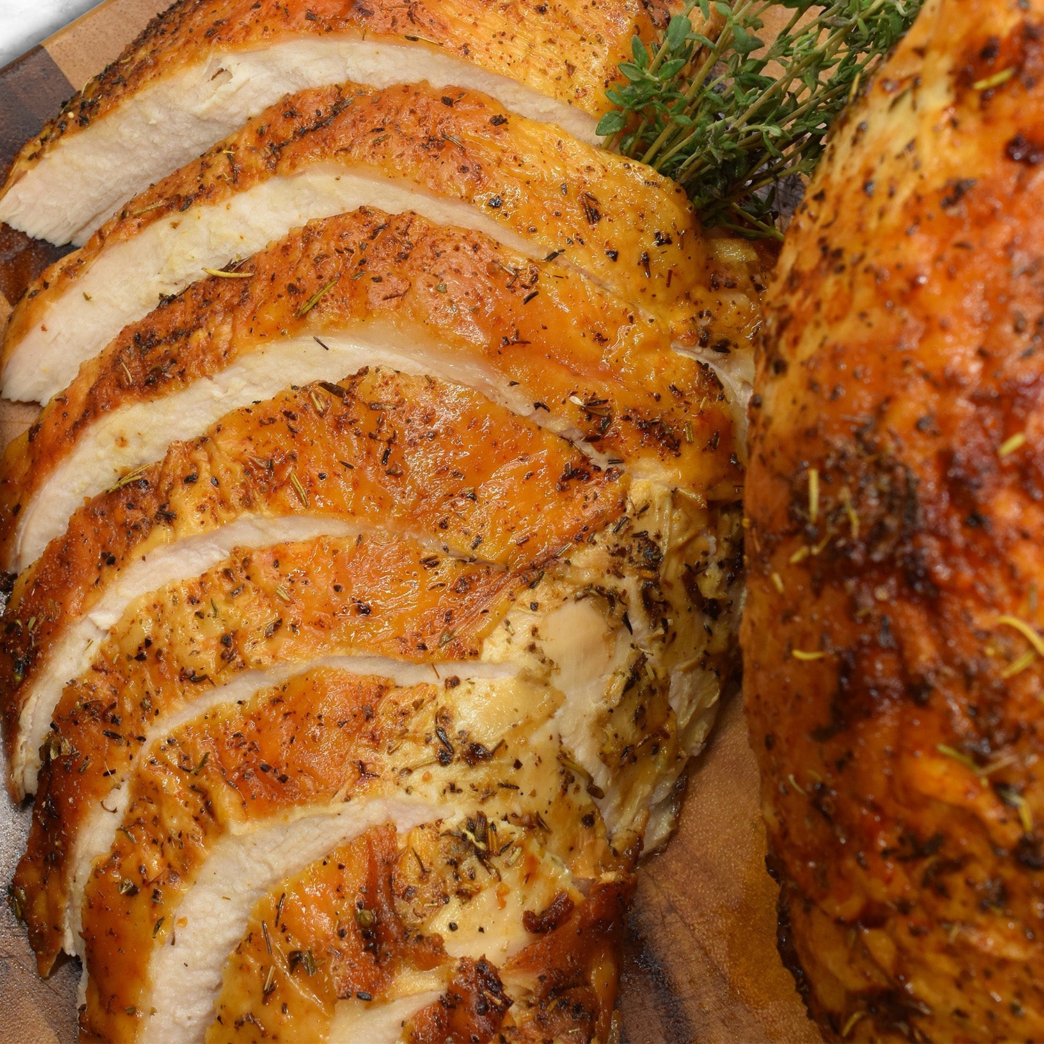 The Turkey Breasts come as a double breast on the bone, serving 6-8 people, and needs to be stored in the refrigerator until ready to serve. You may serve it cold, at room temperature, or it can be re-heated in the oven at 250 for 30 minutes, or until heated all the way through.