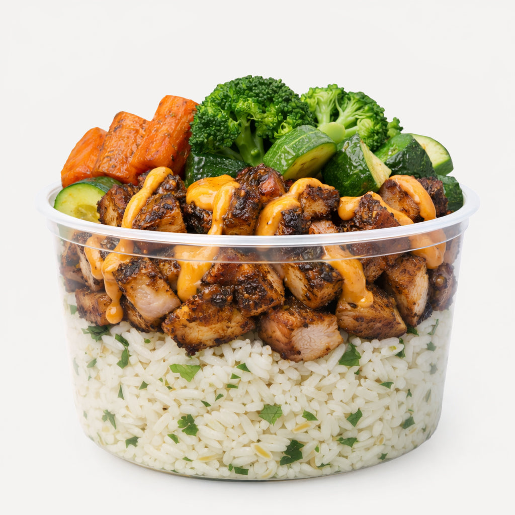 This dish is made with chicken thighs, cilantro lime jasmine rice, honey chipotle lime creamy sauce, carrots, broccoli, zucchini, olive oil, parsley, salt and pepper. (Paleo meals come without rice, and have extra vegetables.)