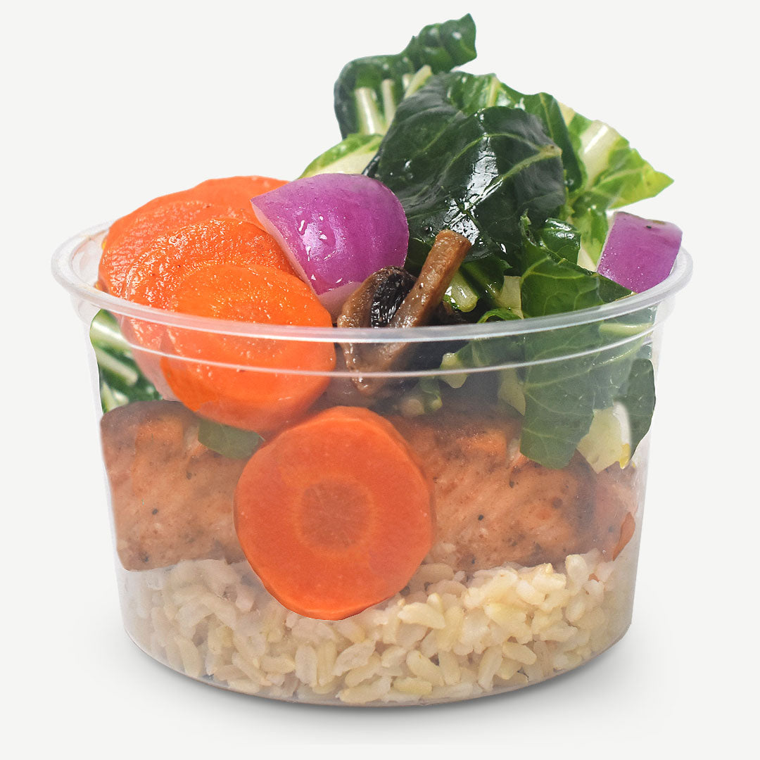 This dish is made with salmon, rice, oranges, lemon, honey, bok choy, carrots, mushrooms, onion, garlic, vinegar, olive oil, paprika, salt and pepper. (Paleo meals come without brown rice, and have extra vegetables.)