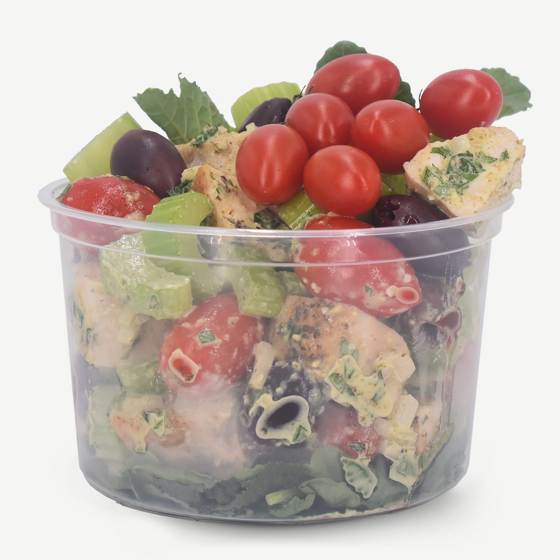 This dish is made with chicken breast, eggs, celery, tomatoes, olives, pepitas, basil, kale, vinegar, olive oil, lemon, dijon, onion, garlic, honey, salt and pepper. Two servings per container.