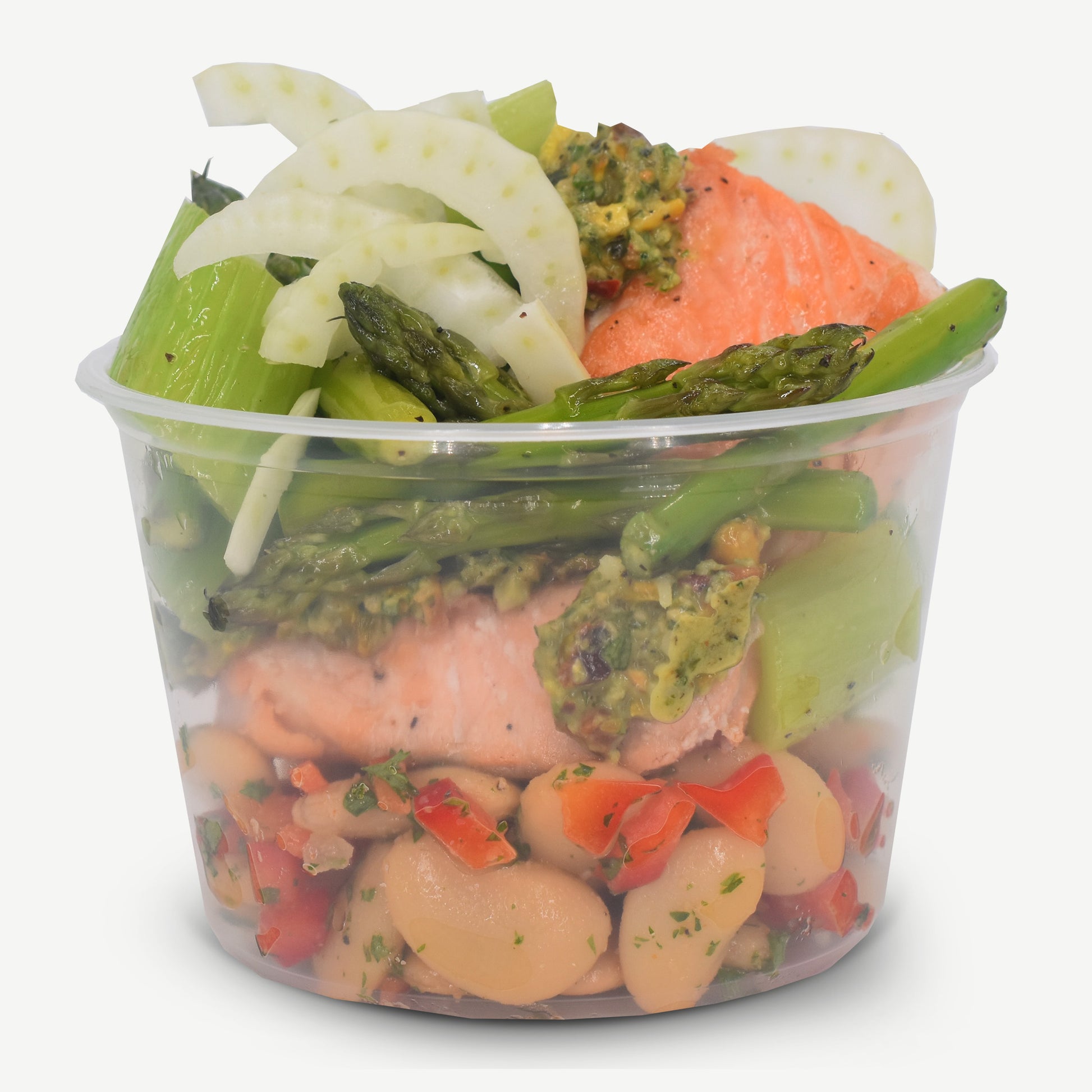 This dish is made with Atlantic salmon, pistachios, cilantro, onion, garlic, pepitas, lemon, white beans, bell pepper, parsley, celery, asparagus, fennel, honey, golden raisins, olive oil, salt and pepper. (Paleo meal comes without beans, and has extra vegetables)