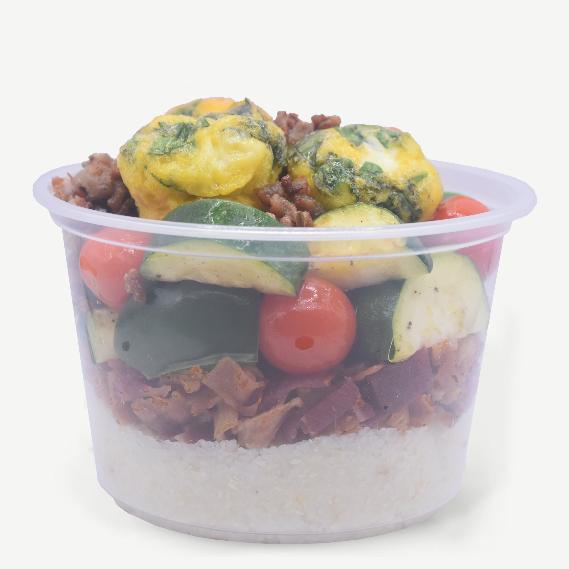 This dish is made with eggs, bacon, sausage, grits, tomatoes, onion, bell pepper, zucchini, scallions, parsley, fennel, olive oil, salt and pepper.