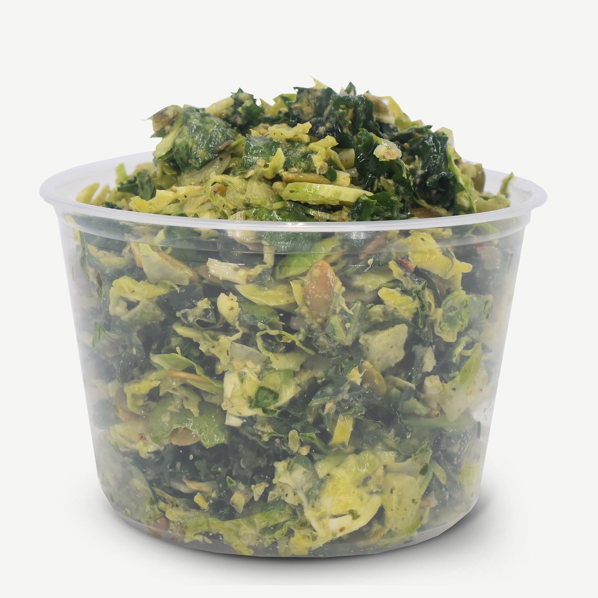 This dish is made with kale, pepitas, brussels sprouts, spinach, basil, lemon, garlic, olive oil, salt and pepper. Nutrition Information (per container):