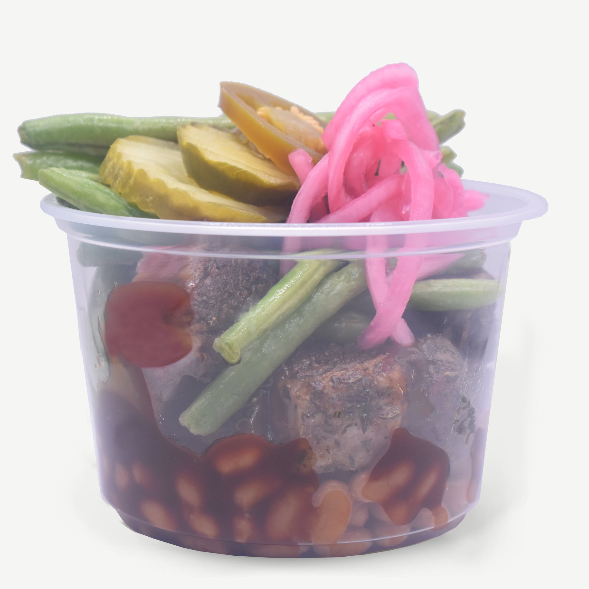 This dish is made with beef brisket, baked beans, green beans, tomatoes, pickles, pickled red onions, pickled jalapeno, mustard, vinegar, honey, turmeric, garlic, onion, olive oil, paprika, salt and pepper. (Paleo meals come without baked beans, and have extra vegetables.)