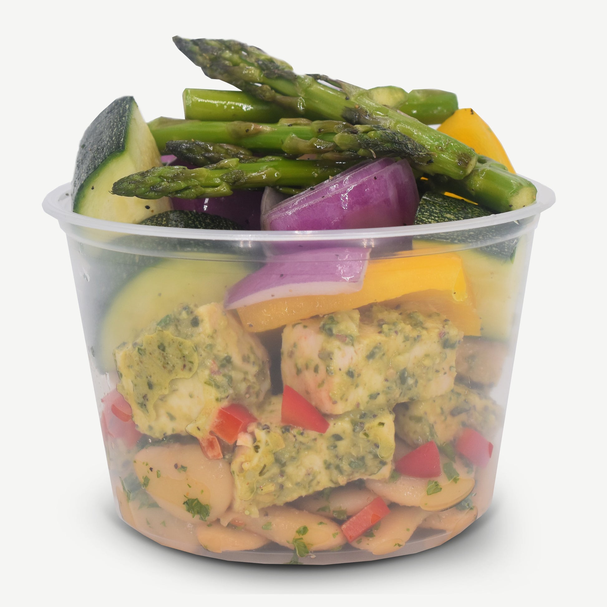 This dish is made with chicken breast, white beans, zucchini, asparagus, walnuts, pepitas, eggs, bell pepper, parsley, spinach, basil, lemon, garlic, onion, olive oil, salt and pepper. (Paleo meals come without white beans, and have extra vegetables.)